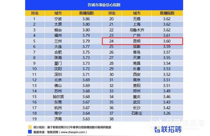 《智联招聘2022年春季昆明白领跳槽指数调研报告》近日发布,其中指出,昆明地区有57.8%的受访白领对2022年的事业取得成就怀抱信心,这个占比高于上一年的50.7%。信心指数虽然略低于全国平均水平3.61,但由去年春季的3.58,小幅提高至了3.6,在全国37个核心城市中排在第24位。