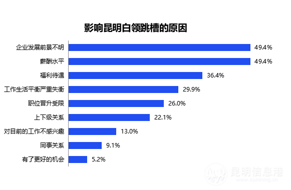 薪酬水平、企业发展前景不明是昆明白领跳槽的主要因素,占比均为49.4%。此外,福利待遇占比36.4%,职位晋升受限占比26%。昆明白领由于“上下级关系”而跳槽的占比,由上一年的13.3%上升到22.1%;由于“同事关系”而跳槽的占比,由上一年的1.7%上升到9.1%。分析认为,这体现出更多昆明白领希望获得和谐的职场人际关系。