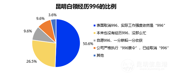 60.2%的受访昆明白领过去一年经历“996”工作制,其中50.6%的昆明白领表示:“表面取消‘996’,实际的工作强度依然是‘996’。”在该选项上,全国平均占比为42.4%。也有9.6%的受访昆明白领表示:“自愿‘996’,一分耕耘一分收获。”在该选项上,全国平均占比为15.4%。