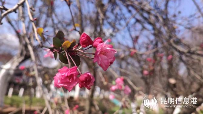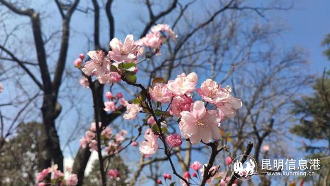 在春日暖阳下,步入昆明动物园海棠大道,只见几株树上呈现了少量刚刚初绽的垂丝海棠、花苞是红艳的颜色,绽放开后便成了一朵朵粉粉的花,垂在枝头。而樱花大道上的云南樱花则基本全是花苞,目前还没有初绽。