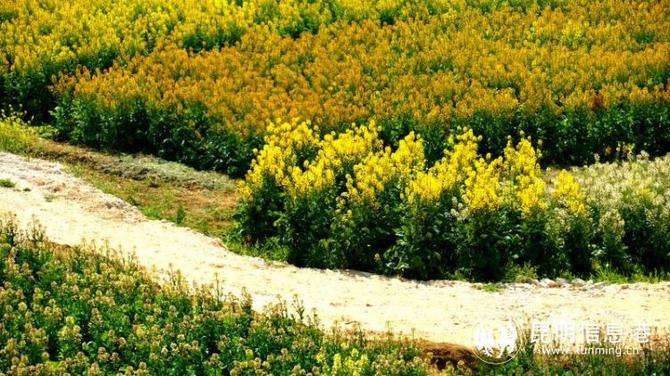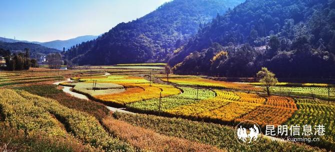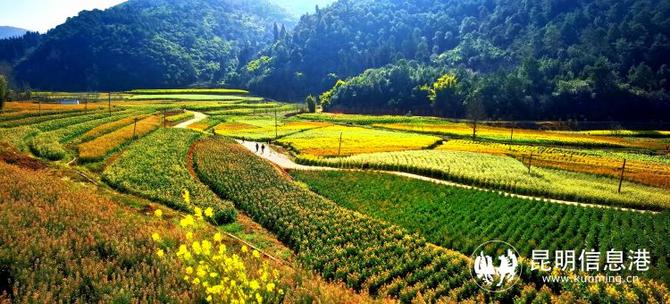 从昆明主城出发,驱车1小时左右来到安宁市温泉街道甸中村委会,在小山谷中的一片田野间,一眼看到种植着少量传统金黄色的油菜花。站到观景台俯瞰,映入眼帘的是田野间交杂着不同颜色的彩色油菜花,桃红、紫焦红、铜红、极紫、深紫红、鹅黄、深土黄、白色、橘色、粉色,还有一些混色,色彩斑斓的彩色油菜花交织在一起,就像打翻了大自然的调色盘一样,缤纷的油菜花渲染了这个独特的春天,极具观赏性,也令人眼前一亮。