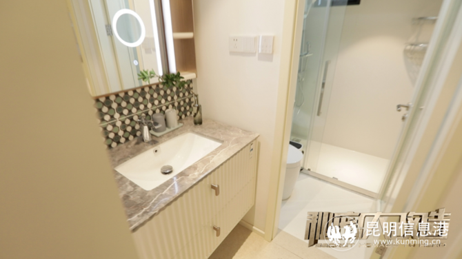 改造前,卫生间干湿不分离。改造后设计师通过调整次卧门的位置,利用原有过道空间将卫生间进行三区分隔,使洗漱区、如厕区和淋浴区相互独立,并且每个区域都有相应储物空间。