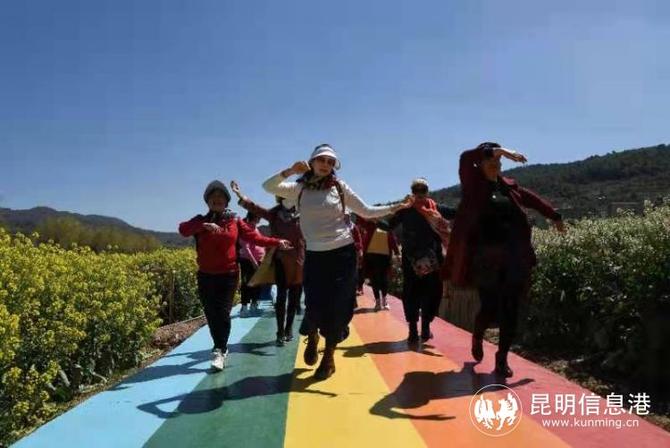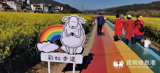 作为今年螳川区域的全新亮点,后山崀村民委员会于去年国庆期间,在与螳川一河之隔的牧羊村民小组区域,将拆除大棚后的200亩土地进行重新规划,扩种了传统的金黄色油菜花。同时,后山崀村民委员会与云南农业大学合作,在花田中布景种植了6个颜色的彩色油菜花,彩色油菜花构成一列“美丽乡村号列车”图案,这列花田火车分1个车头和5节车厢,分别用红色、深粉色、桃红色、浅粉色、樱花白色等不同颜色的彩色油菜花装点,牧羊村“美丽乡村号”列车寓意温泉街道办事处带领辖区5个村(社区)共同实现五大产业振兴,齐心合力、奋发向上,构筑温泉街道发展新局面。