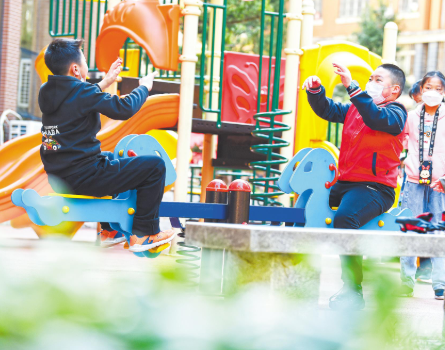 2022年3月9日,武汉东湖新城社区的儿童在小区广场上玩耍。(湖北日报全媒记者 李溪 摄)
