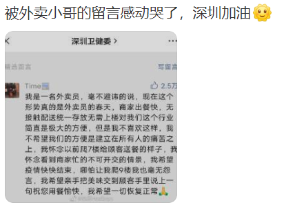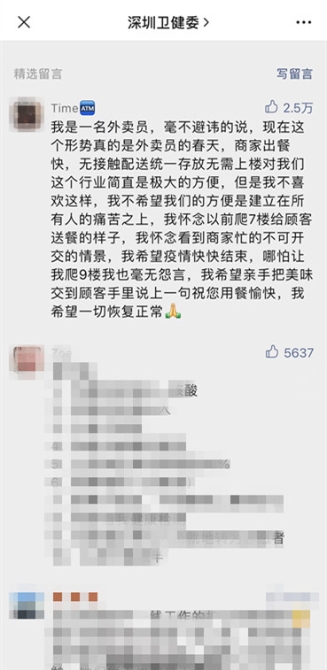 3月12日上午,深圳卫健委公号下一位外卖小哥的留言冲上热一,几个小时内点赞数就达到近三万。