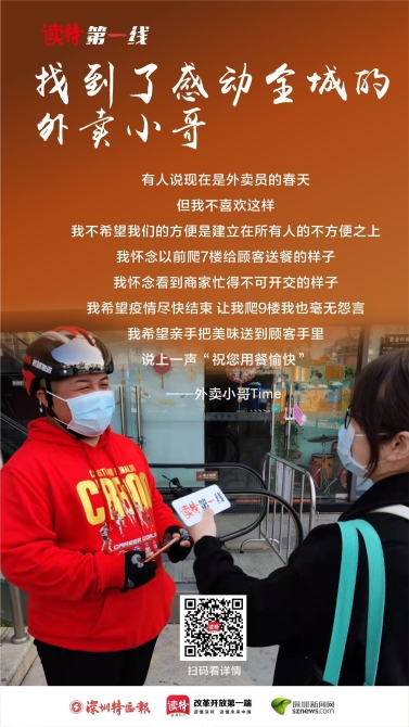 中午,《读特第一线》在宝安找到了这位感动深圳全城的外卖小哥,知道了他名叫“田猛”。因为疫情防控,全市停止了堂食,读特第一线的记者和田猛站在户外,进行了对话。