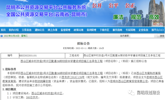 公告显示,该项目为西山区城中村改造3号片区配套中学,业主为昆明市西山区教育体育局,计划工期300日历天。