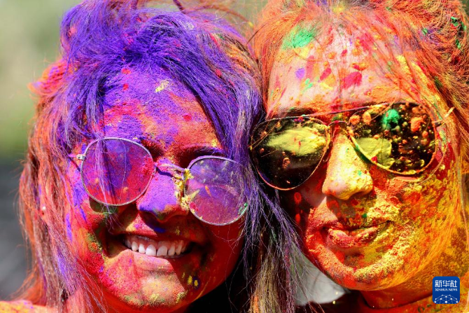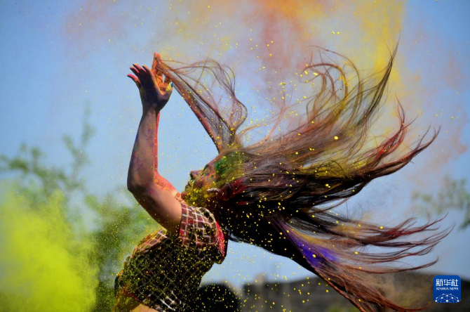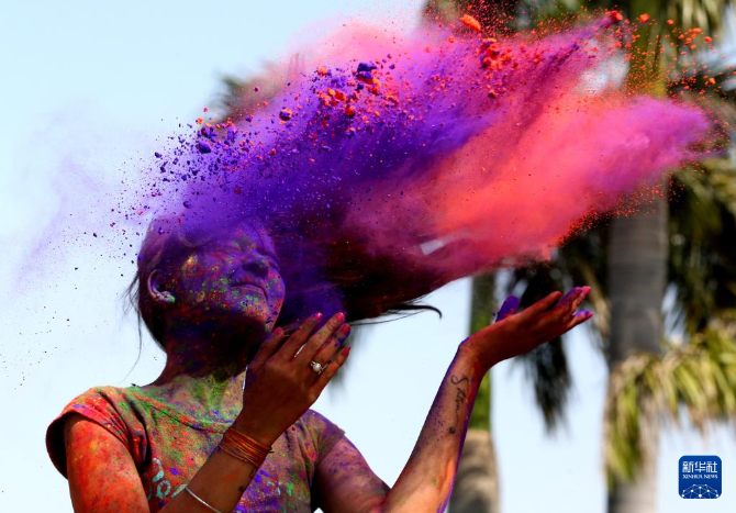 近日,印度多地举行活动庆祝传统节日洒红节。洒红节也叫胡里节,人们在节日期间互相涂抹颜料,载歌载舞迎接春天的到来。