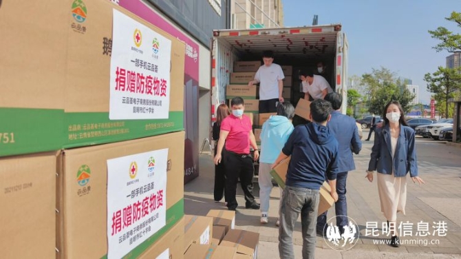 18日上午,6000盒鹅油草果自热米饭从“一部手机云品荟”装车发往昆明市红十字会,将由市红十字会接转各区防疫检测点,为正在岗位上奋战的一线人员送去温暖和关爱,为打赢疫情防控阻击战贡献企业力量。