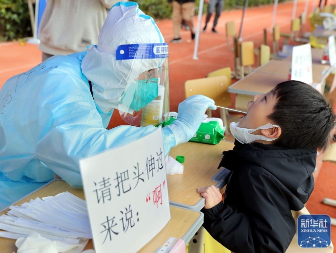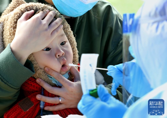 3月19日,一名1岁多的小朋友在妈妈帮助下接受核酸采样。