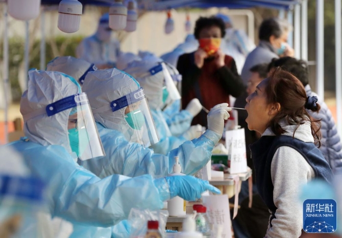 3月19日,检测人员为上海康城居民进行核酸采样。