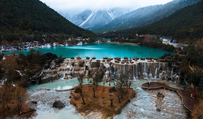 1月13日拍摄的蓝月谷(无人机照片)。位于云南省丽江市玉龙雪山东麓的蓝月谷风景区,冬日山谷间云雾弥漫,白雪点缀,别样美丽。(新华社记者 王冠森 摄)