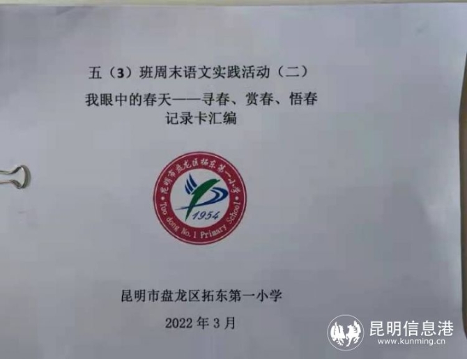 宋代理学家朱熹有诗云“胜日寻芳泗水滨,无边光景一时新。等闲识得东风面,万紫千红总是春”。儿童眼中的春天更是细腻的、多彩的、绚烂的。拓东第一小学五(3)班的孩子们在语文老师唐捷的组织和课堂教学的引领下,利用周末开展在小区里“寻春、赏春、悟春”为主题的语文实践活动。