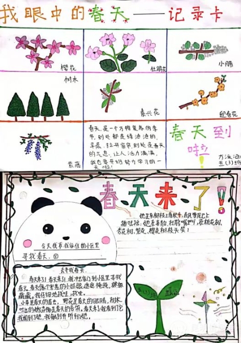 在活动中,孩子们走近大自然,用自己的方式与春天亲密接触:嗅一朵花香;在草地上打几个滚;静静地在小径散步;奔跑在阳光下……有了亲身体验后,孩子们“我手写我心”,他们把春天揉进了画里,把春天写进了优美的文字里,把春天定格在了一张张笑脸上。春之美好在于新生萌动,春之美好在于花开艳丽,春之美好在于心怀希望,春天是一个美好的季节,孩子们怀着美好的心情,收获了每个周末的充实。此时作业不过是美好心情的记录罢了。
