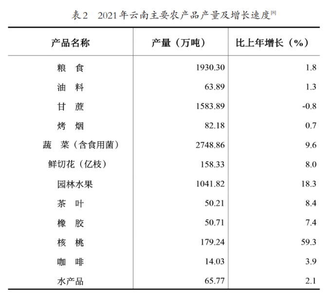 [8]除粮食、鲜切花和水产品外,其余农产品产量均为快报数;2021年核桃产量按鲜果统计。