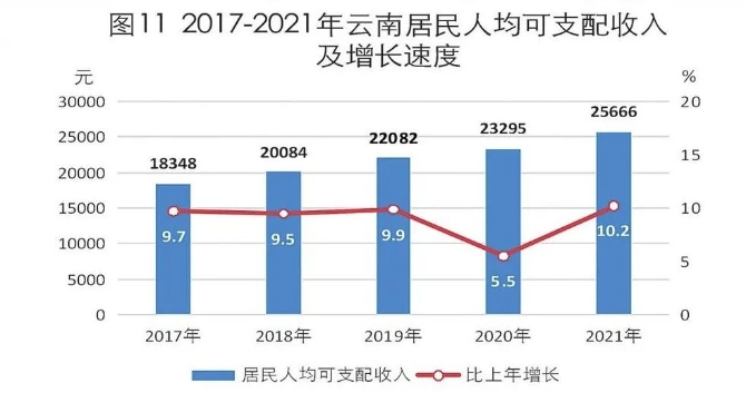 [18] 居民人均可支配收入数据由国家统计局云南调查总队提供。居民人均可支配收入指通过住户收支与生活状况调查取得的,调查户在调查期内获得的、可用于最终消费支出和储蓄的总和,即调查户可以用来自由支配的收入,除以家庭常住人口得到的人均收入。可支配收入既包括现金,也包括实物收入。按照收入的来源,可支配收入包含四项,分别为:工资性收入、经营净收入、财产净收入、转移净收入。按常住地分,得到城镇和农村居民可支配收入。