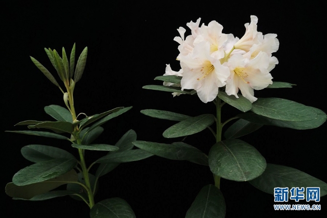 “高山杜鹃品种‘贵妃醉酒’花瓣多呈乳白色,植株常绿、叶片无鳞、叶色深绿,花为阔漏斗形,花蕾呈乳黄色,花带香,花冠裂片颜色初开时是乳黄色,花冠裂片内有橙红色斑点,雌蕊柱头颜色为暗红色,花药为黄色,清新淡雅的颜色让‘贵妃醉酒’多了一丝神秘,同时又多了几分高贵典雅。”这是参与培养过程的研究员们对这一独特的高山杜鹃品种的描述。