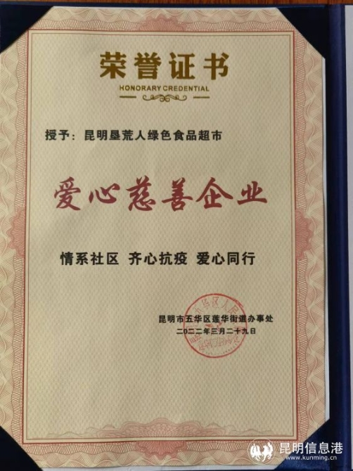 昆明垦荒人绿色食品连锁超市被授予荣誉奖牌、证书