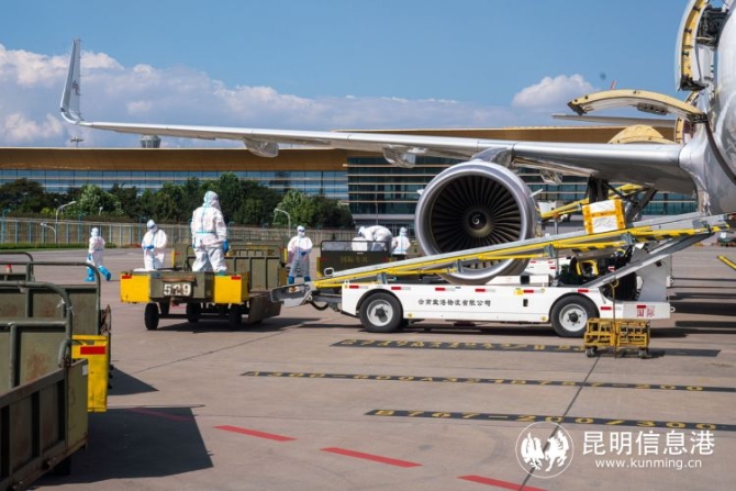 与此同时,昆明机场与海关、边检、驻场专班、航司等各保障单位共同建立了联防联控机制:严格执行一航班一航班长、一培训、一消杀、一复盘的“4个一措施”;所有入境旅客完成测温、核酸采样、健康申报和边检、海关查验并提取行李后,在S1卫星厅行李提取处由地服人员引导登上昆明市驻场专用转运车辆,地服人员与转运人员完成现场交接后,转运车辆经飞行区2号道口驶出昆明机场,直接将旅客运送至隔离酒店进行隔离;入境旅客托运行李从所在航班上搬运至行李运输车辆时,进行第一次消杀,待行李统一运送至S1卫星厅行李分拣大厅后,进行第二次消杀;各保障单位所有工作人员需着三级防护统一进入工作区域开展保障,保障工作结束后,所有工作人员在指定方舱完成防护服脱卸,并统一乘坐专用车辆至昆明机场“两集中”(集中住宿、集中工作)点休息;对入境航班保障工作人员实行“两集中”管理,两集中点居住人员严格落实“14+7+7”举措,即14天封闭管理作业+7天集中隔离医学观察+7天居家健康监测。所有保障工作人员需完成3针剂疫苗,实施2天一次核酸检测,专业消杀人员及医废垃圾处置人员每天开展一次核酸;每一班国际入境航班保障结束后,昆明机场立即对专用区域及保障使用的车辆和设施设备开展全面消杀。