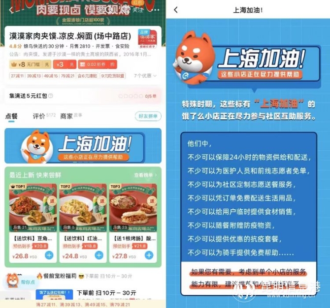 “前线志愿者可联系老板免单”、“为有需要的市民和防疫志愿者免费提供凉皮”……近日,记者在饿了么平台看到,“上海加油”的蓝色标签出现在不少上海外卖商家店名前,门店推荐页上还出现了特殊的“商品评价”。