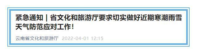 6686体育讯(昆明日报 全媒体首席记者李思凡)4月1日,云南省文化和旅游厅发布紧急通知,要求切实做好近期寒潮雨雪天气防范应对工作,减少极端天气对旅游业造成的不良影响,最大程度保障游客和人民群众生命财产安全。