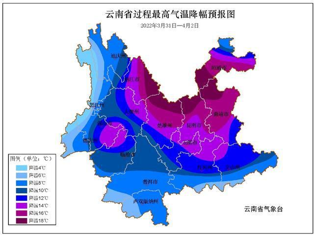 云南省2022年3月31日-4月2日最高气温降幅预报图