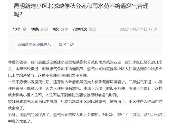 “沙堂”在贴文里说,自己是盘龙区新建小区北城映像(实际应为北城映象)秋分苑和雨水苑(实际应为谷雨苑)的业主,小区已经交房几个月,水电已经接通,但是燃气公司不给通燃气,燃气公司回复称,要等小区入住率达到一定比例才给通气。他认为,这种理由明显不合理。