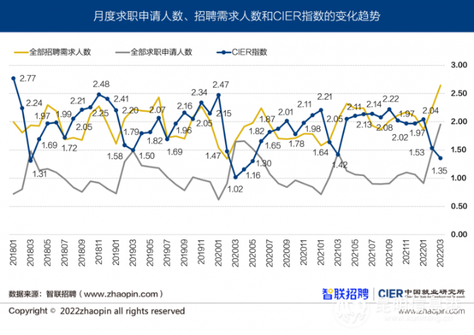 中国人民大学中国就业研究所与中国领先的职业发展平台智联招聘,近日联合推出《2022年第一季度中国就业市场景气报告》。其中指出,2022年一季度CIER(就业市场景气指数)为1.56,低于上季度的1.99与去年同期的1.66,就业形势总体来看较为严峻。