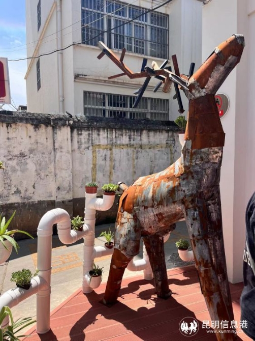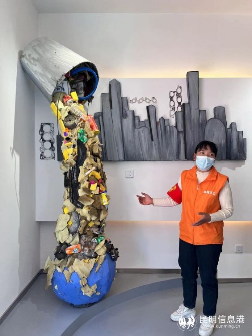 垃圾分类体验馆门口,利用废铁制作的鹿“毛渣渣”正抬头仰望嵌入房子的铁树,树上有两只小动物“铁眼仔和卷皮兄弟”;踏入馆内左侧,一只盛满垃圾的桶正无止境向我们的蓝色星球倾倒垃圾;用棉花、泡沫、废铁制作而成的帆船,这些都是嵩明县生活垃圾分类体验馆中的创意雕塑,既吸人眼球,又充满深意。