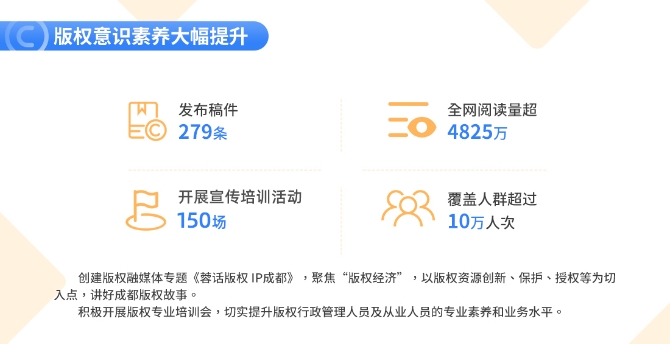 创新是引领发展的第一动力,保护版权就是保护创新。成都是全国首个版权示范城市,连续三年蝉联全国“查处重大侵权盗版案件有功单位一等奖”,荣膺世界知识产权组织“中国版权金奖·管理奖”,成为全国第三个、中西部首个获批设立“国家版权创新发展基地”的城市。