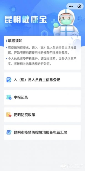 据昆明市应对新型冠状病毒感染肺炎疫情工作领导小组指挥部消息,4月30日0时起,来(返)昆人员须至少提前24小时,通过“昆明健康宝”小程序进行报备。老人、儿童等无法使用小程序的特殊情况,须以电话方式向目的地社区进行报备。