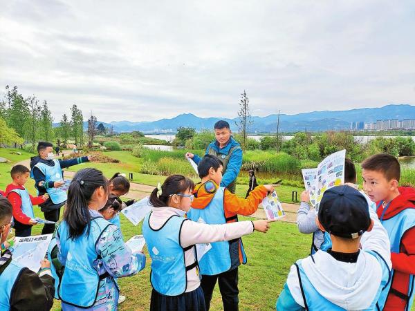 孩子们在滇池湿地学习生物多样性知识。