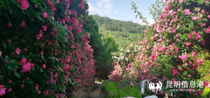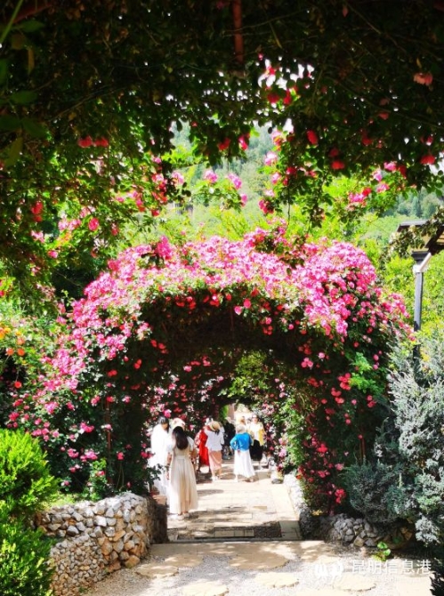 进入庄园看到,今年第一轮开放的古桩月季目前还有少量在开放,而蔷薇花则开得正盛,一团团一簇簇地聚集在一起,形成了拱形花门和立面的花墙,成千上万个小花朵迎着阳光张扬怒放,独自妖娆;也有的花朵娇羞地低头默默绽放着,好似轻语呢喃、深情款款,平添几许宁静。白的、粉的、红的……美丽的蔷薇花演绎着属于这个季节的童话,每一朵小花都散发着小家碧玉般温馨又浪漫的气息,满园的馨香更是让到来的游客心都醉了,感觉生活在四季如春的鲜花之城是一件幸事,如此美景,让游人目不暇接、流连忘返。