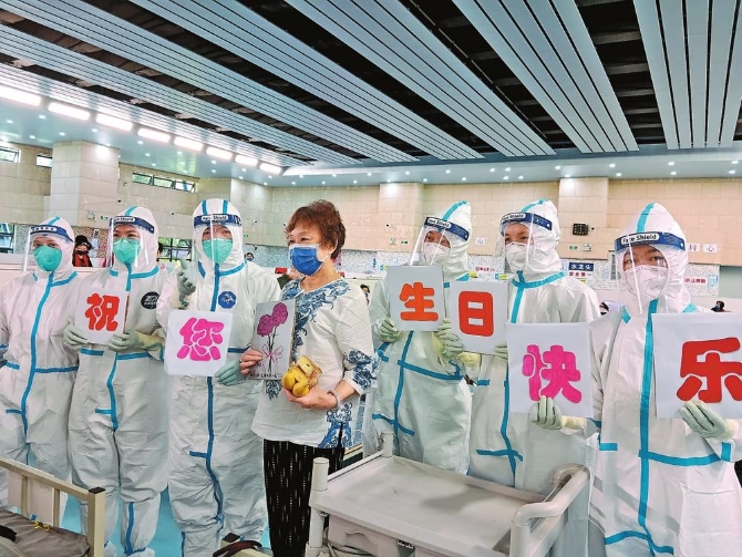 近日,上海市黄浦区龙华东路方舱医院内,云南援沪医疗队员们带着精心准备的礼物,为一位老年患者送上生日祝福。