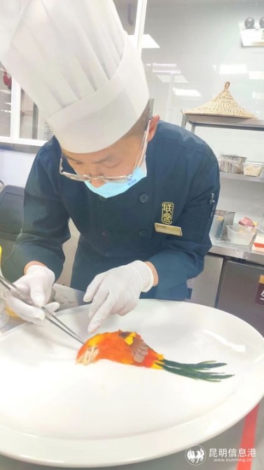 昆明航天科技投资发展有限公司昆明华邑酒店行政总厨陈海星说:“每届度假区组织的烹饪大赛我们都参加,今年主题是以花为特色,所以用了金雀花、玫瑰花等可食用的花材。同时结合昆明与广东的口味,利用可食用花材在菜品上做了大胆创新。比如用玫瑰馅加广东叉烧创新制作了‘玫瑰雪山包’;‘鲜花门丁饼’是用云南食用野生菌加鲜花做馅,为咸鲜口味;‘陈皮煎焗金多宝’在煎鱼过程中加了广东陈皮;‘玫瑰汁咕噜肉’用玫瑰汁加水果熬出酸甜口味。应该说,广东与昆明都是花城,但广东很多花是观赏发生,云南则有很多可食用的花卉,感觉在昆明做烹饪,结合粤菜的制作方法,可把昆明的食用鲜花用在炖汤、清炒、海鲜上,使二者能很好地融合。”