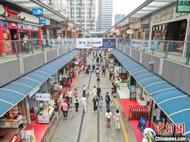 图为无人机航拍江西南昌一美食街,不少市民在逛街品尝美食。 刘力鑫 摄