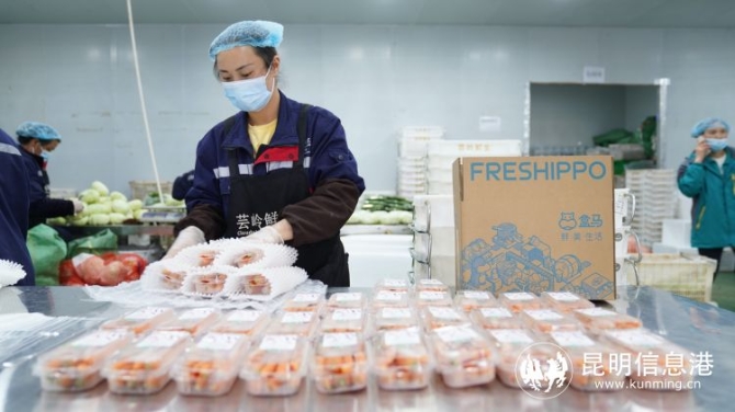 盒马村蔬菜加工车间,产业工人正在给蔬菜打包