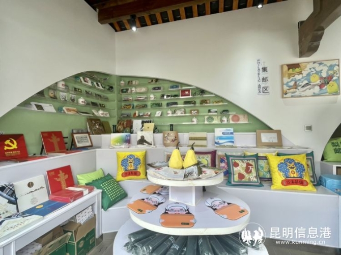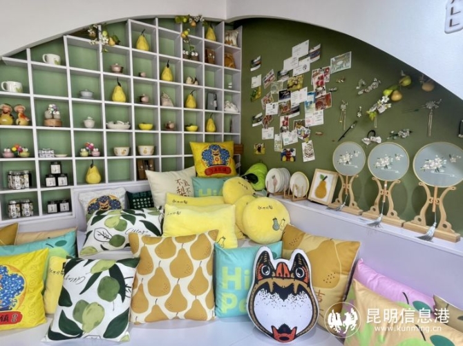在呈贡万溪冲社区的梨好邮局,琳琅满目的“宝珠梨”文创衍生品摆满商店,梨抱枕、绘本、背包……可爱的宝珠梨形象,让游客们爱不释手。邮局墙面采用四个梨子抽象造型,形成函件墙、明信片录制区、吧台背景墙、时光留言墙,设置了文创展示售卖、邮戳集邮、吧台服务、梨产品售卖、拍照打卡留念等功能区。