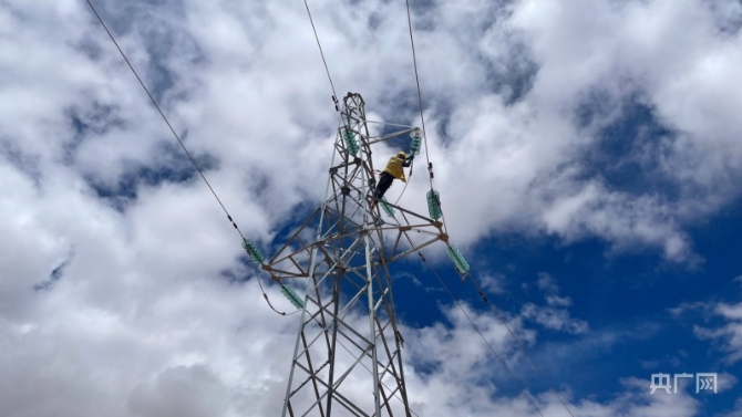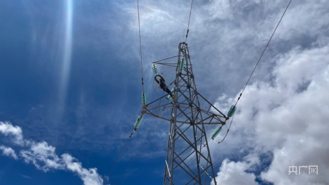 电力线路工在18米铁塔检修悬式绝缘设备(央广网发 周贺 摄)