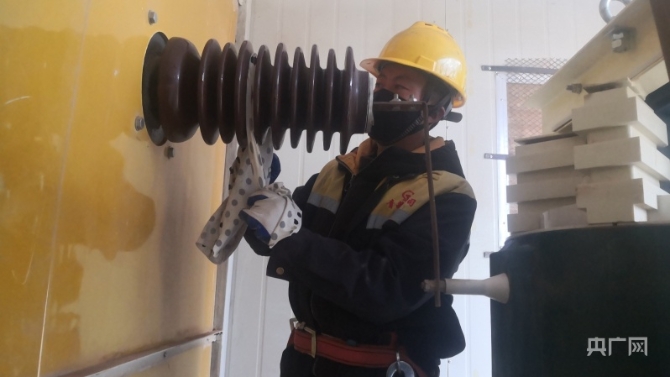 电力线路工在清洗绝缘设备(央广网发 周贺 摄)