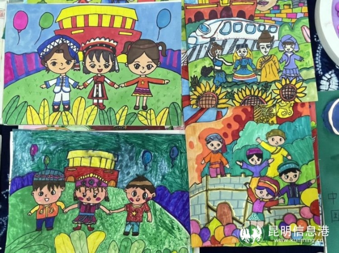 蓝天白云下,五星红旗前,不同少数民族的孩子牵手在天安门前跳舞;长城上、高铁旁,各民族的孩子们欢快玩耍……一幅幅收录在作品陈列室里的绘画作品,描述了学生心目中“民族团结一家亲”的样子,同时也是洱源县宁湖第二小学,通过多措并举、创新载体,抓实民族团结进步教育工作的生动缩影。