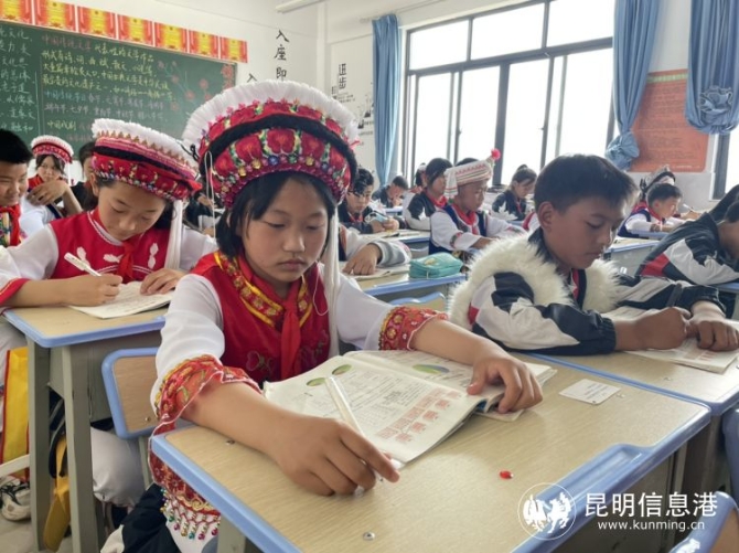 走进洱源县宁湖第二小学,教学综合楼的外墙上,“铸牢中华民族共同体意识”几个大字被挂在最醒目的位置;民族文化长廊边,几个学生正在认字;美术课上,在老师的指导下学生们正在以“民族团结”为主题,进行每学期一次的书画剪纸比赛;教室里,身着白族、傈僳族、彝族服装的学生气氛融洽,朗朗读书声不绝于耳;课余时间,学校自编自创的唱跳《霸王鞭舞蹈操》,成了校园大课间的快乐旋律。