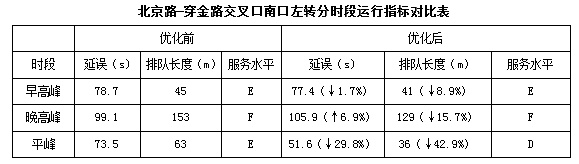 通过对以上三个交叉口掉头点优化后,北京路沿线交叉口通行效率得到了有效提升,以北京路-穿金路交叉口为例,通过调整掉头点及优化信号相位后,平峰时段改善效果最为明显,南口左转延误指数下降29.8%,排队长度下降42.9%。