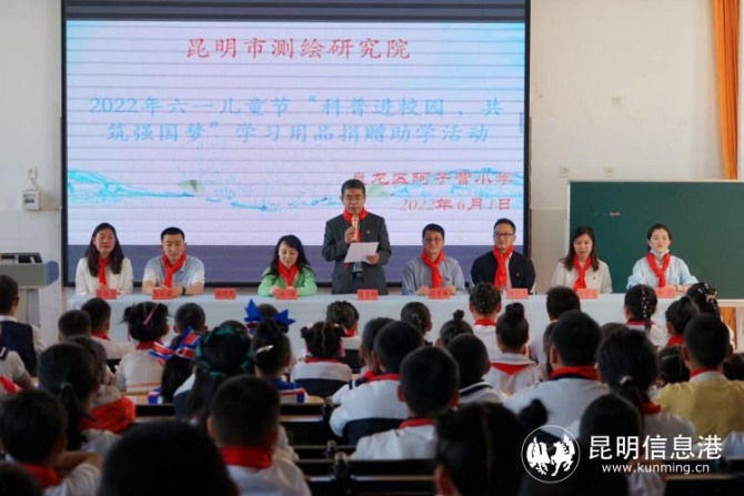 昆明市测绘研究院院长侯至群表示,昆明市测绘研究院全体干部职工,为阿子营小学的优秀学生代表献上一份礼物,并向辛勤耕耘、呕心沥血培育祖国花朵的学校领导及老师们致以崇高的敬意;向阿子营小学全体小朋友们、少先队员们致以节日的祝贺。