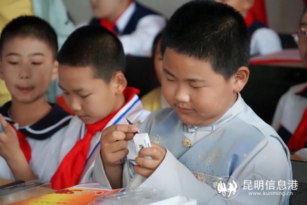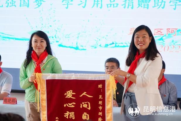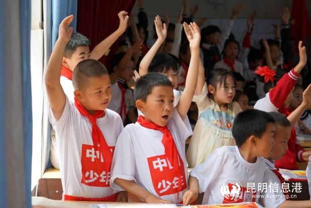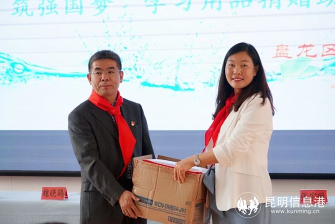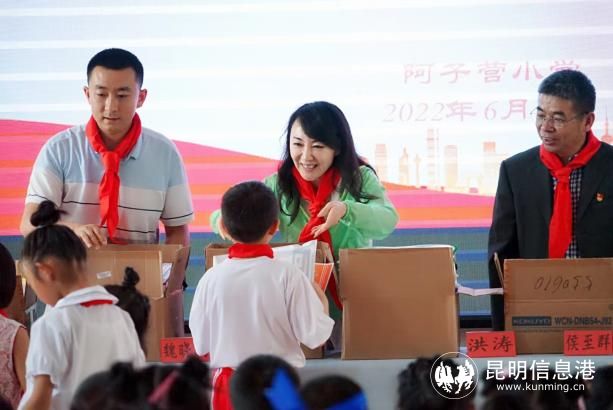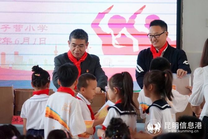 活动中,阿子营小学少先队员为昆明市测绘研究院职工献戴红领巾,同时,测绘院职工为优秀学生代表颁发奖品。