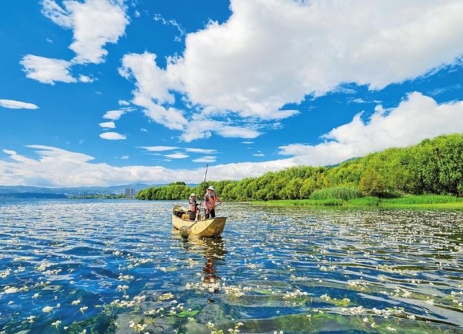簇簇海菜花点缀的洱海湖面上,工作人员正在开展保洁作业。 通讯员杨继培 摄