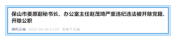 记者从清风云南获悉,保山市委原副秘书长、办公室主任赵茂琦严重违纪违法被开除党籍、开除公职。详情如下: