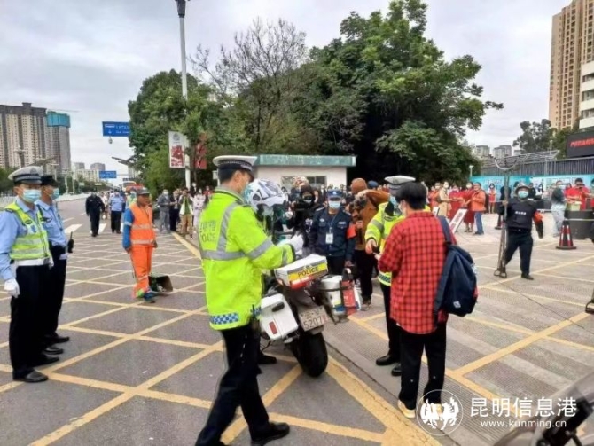 8时41分,在昆明市第一中学西山分校门口,一名考生着急地向执勤民警求助:自己跑错考场,现在考试马上要开始了……西山公安巡特警大队民警立即向指挥中心报告,联合交警一道驾驶摩托车将考生火速送往4公里外的西山区第一中学考点,仅耗时5分钟就安全到达。