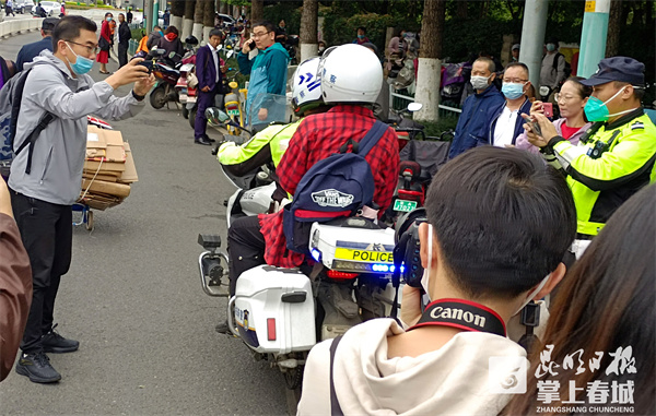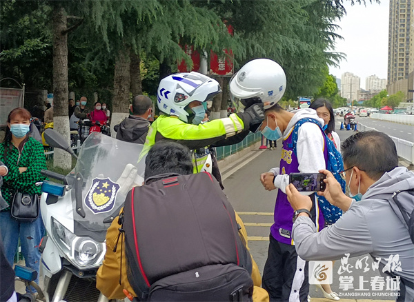 7时33分,交警载着考生安全返回昆一中西山学校考点,考生道了一声“谢谢!”拿着准考证顺利进入考场。