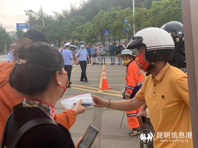上午8时,昆三中的老师向考场外民警求助,称一名该校在师大附中考点的考生身份证、准考证忘拿了,民警骑摩托一路狂奔,于8时08分,将身份证、准考证送到该考生手中。